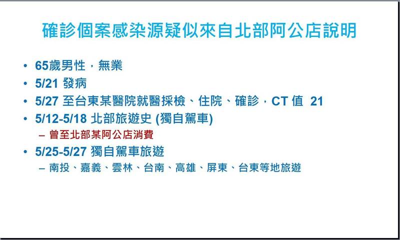 不過,根據衛生局公布確診者足跡發現,這名大叔到台北阿公店消費後,18日回到彰化縣二水家鄉看年邁的媽媽,去過當地的長照機構,21日出現發燒、倦怠等身體不適,大叔不以為意,未就醫治療,25日獨自再從二水開車南下旅遊,先到南投信義鄉塔塔加欣賞風景,再驅車往雲林投宿旅舍,隔天26日早上去雲林北港朝天宮和長益囍餅店,買完名產繼續南下,沿路又到台南玉井青果集貨場買芒果,再到屏東枋山東隆堂拜拜,26日當晚抵達台東,27日出現寒顫、嗜睡症狀,就近在當地醫院就醫採檢,確診感染,目前留在台東縣醫院治療中。