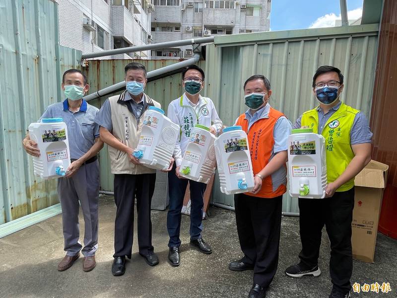 莊競程(中)、曾咨耀(右1)結合企業,透過里長為台中市公寓大樓免費提供民眾次氯酸水。(記者蔡淑媛攝)