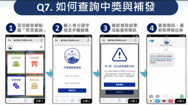 客委會將於10月25日統一發送第一梯次中籤民眾領取票券簡訊,中籤民眾在收到領券簡訊後,點開簡訊中連結並輸入身分證字號後4碼後即可取得客庄券QR Code,預計11月中旬開始用券。