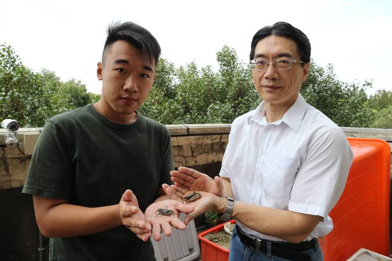興大生科系施習德教授(右)與研究生張凱投入臺灣旱招潮戶口大普查,發現近年來海岸的開發和紅樹林的栽植,嚴重破壞其棲息地,導致族群數量大幅降低,極需加以保育。(興大提供)