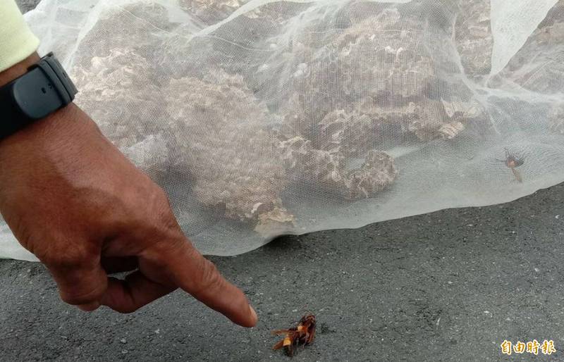 飛竄出的虎頭蜂用盡殘力不斷掙扎,最後仍是一命嗚呼。(記者陳賢義攝)
