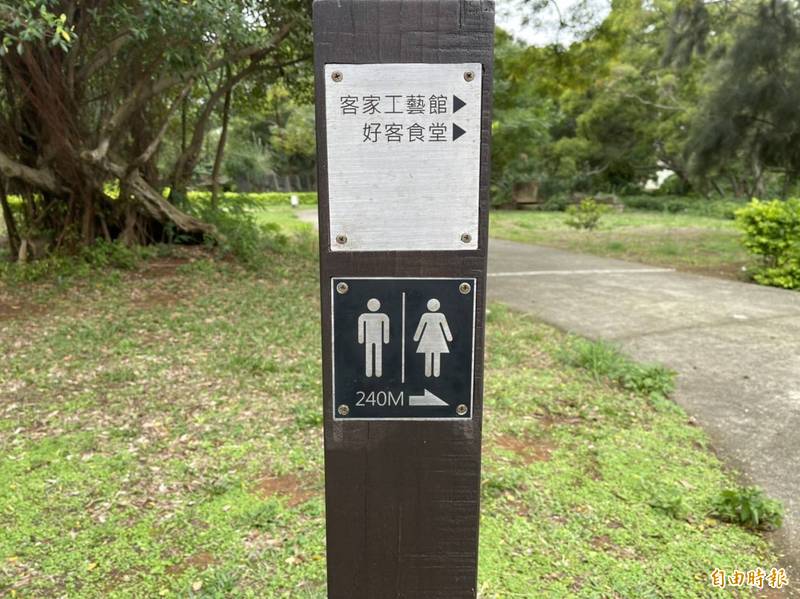 觀音區崙坪文化地景園區內的廁所指引有常見的男生與女生示意圖案。(記者周敏鴻攝)