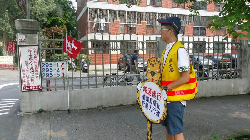 興大在週間早晚時派專人舉牌宣導騎單車交通規則。(興大提供)