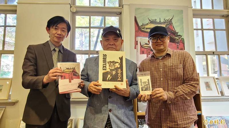 新生代版畫家洪福田(右)為老師潘元石(中)的回憶錄潘元石《歲月凝視:潘元石的藝術之路》,製作限量紀念藏書票,左為台南市文化局長葉澤山。 (記者劉婉君攝)