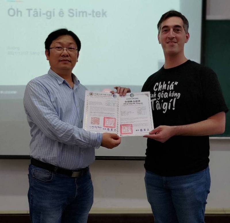 Youtuber美國阿勇(右)去年取得「全民台語認證」中高級(B2)及「台語白話字檢定」高級(C級),左為成大台灣語文測驗中心主任蔣為文。 (成大台文中心提供)