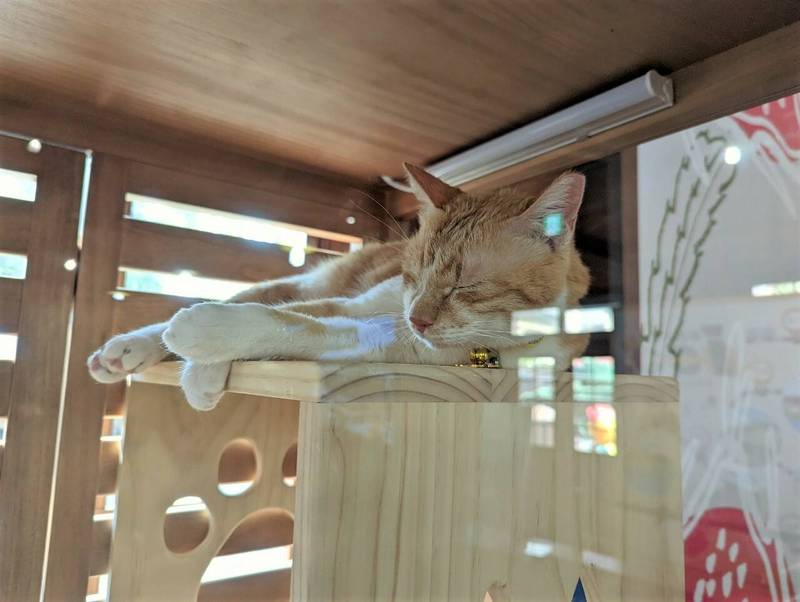 集集火車站貓站長就任,在站旁鐵道倉庫貓屋就可看見「龍蕉Sun」上班。(集集鎮公所提供)