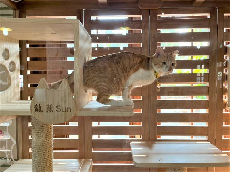 集集火車站貓站長就任,在站旁鐵道倉庫貓屋就可看見「龍蕉Sun」身影。(記者劉濱銓攝)