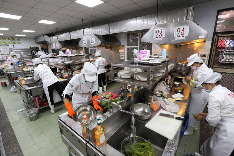 台南第3屆校園營養午餐廚藝賽如一場嘉年華交流廚藝。圖為22日在亞洲餐旅比賽情形。(南市教育局提供)