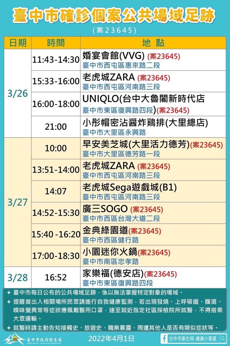 衛生局長曾梓展說,案23645已施打3劑疫苗,無新冠肺炎相關症狀,3月26日參加VVG餐廳婚宴,3月26日至28日期間曾到老虎城ZARA及Sega遊戲城、UNIQLO大魯閣新時代店、大里小彤帽密沾醬雞排、大里早安美之城、廣三SOGO、金典綠園道、南區小園迷你火鍋及家樂福德安店等,3月30日接獲衛生局通知至院所採檢陽性確診。