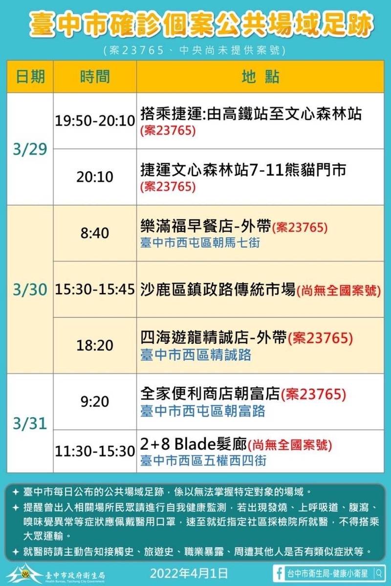 經疫調結果,案23765於3月29日晚間7點搭高鐵回台中,再轉搭捷運至文心森林站,至7-11熊貓門市購物後,騎車回租屋處。3月30日至31日期間曾至樂滿福早餐店(外帶)、四海遊龍精誠店(外帶)、全家便利商店朝富店等處。目前接觸者持續匡列中。