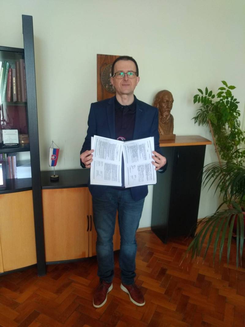 考麥紐斯大學藝術學院院長Marián_Zouhar教授手持簽署後之中、英文「台灣漢學資源中心」合作協議。(國圖提供)