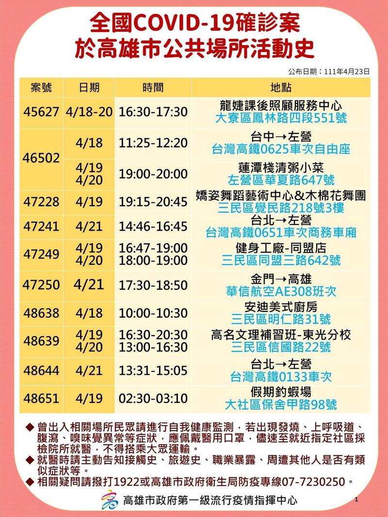 此外,楠梓區建楠路PRO撞球運動館、大社區金龍路大社游泳池、三民區中華三路與三民街周邊三民市場、寒軒國際大飯店觀海軒中餐廳、鳥松區本館路靜思園,均有確診個案足跡。