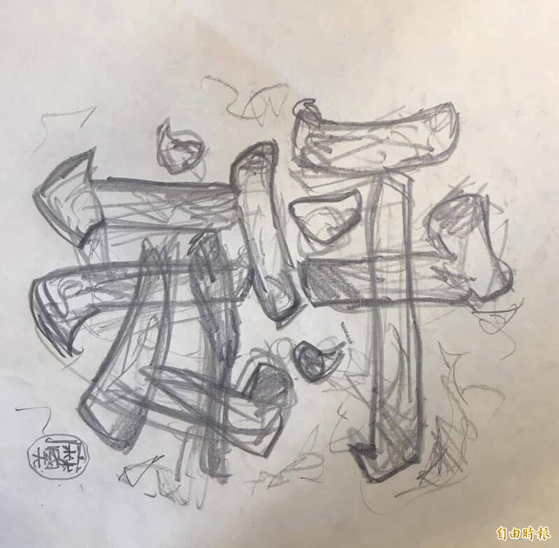 林國慶設計師在地震後用創作寫下了當時的心境,將地震的「震」字作為翻轉文字。(記者李惠洲攝)