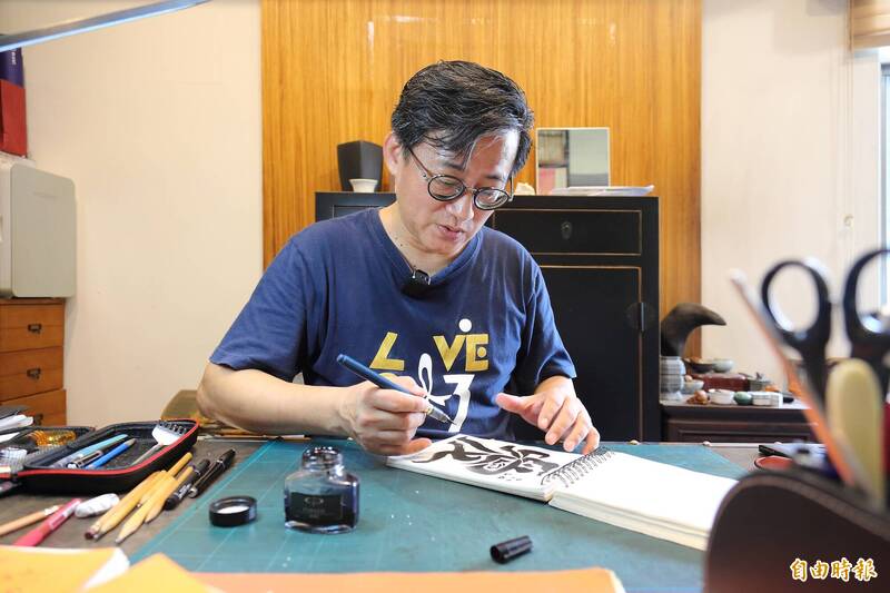 林國慶設計師是世界第一個漢字翻轉發現者,專研翻專文字已經有數十多年,目前已經設計出一千多種翻轉圖形文字。(記者李惠洲攝)
