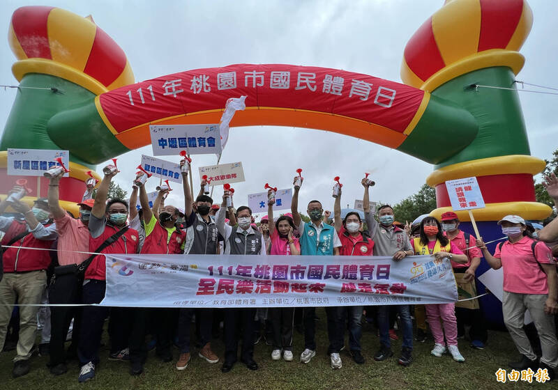 市長鄭文燦、體育局長莊佳佳、桃園市八德區體育會榮譽理事長暨市議員呂淑真、市議員蔡永芳、段樹文等為健走活動鳴笛起走。(記者陳恩惠攝)