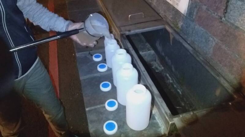 八德福德橋河面漂浮大量泡沫,桃市府環保局稽查人員採水樣送驗。(桃市府環保局提供)