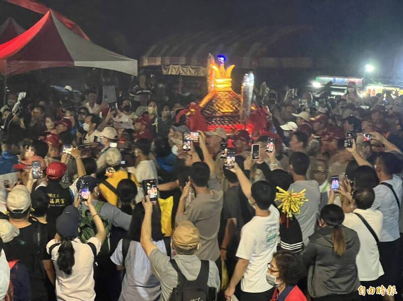 大甲媽鑾轎今天晚上8點10分抵達西螺大橋頭,現場湧入數萬名信眾迎接。(記者黃淑莉攝)
