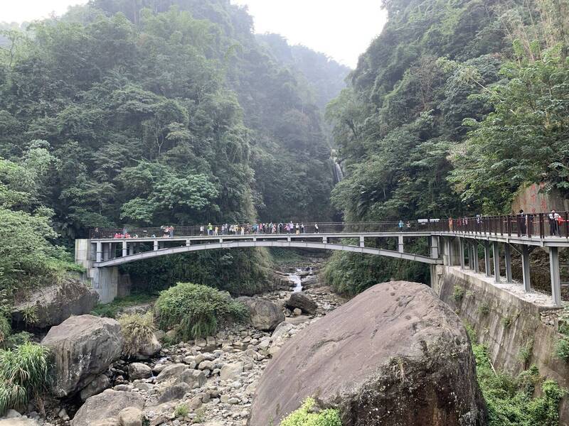 高雄旅展南投館推出熱門景點買一送一活動,只要現場購買龍瀑布園區(如圖)的入場券,就能免費獲得清境高空觀景步道的入場券。(南投縣政府提供)
