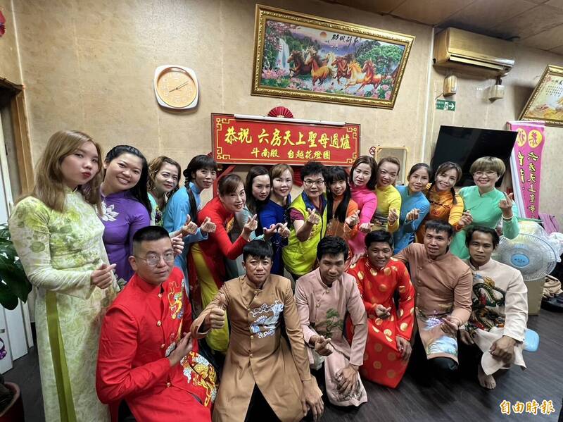 越南新住民、移工今天參加六房媽過爐,昨天晚上還特別穿上傳統服會合後前往參拜六房媽。(記者黃淑莉攝)