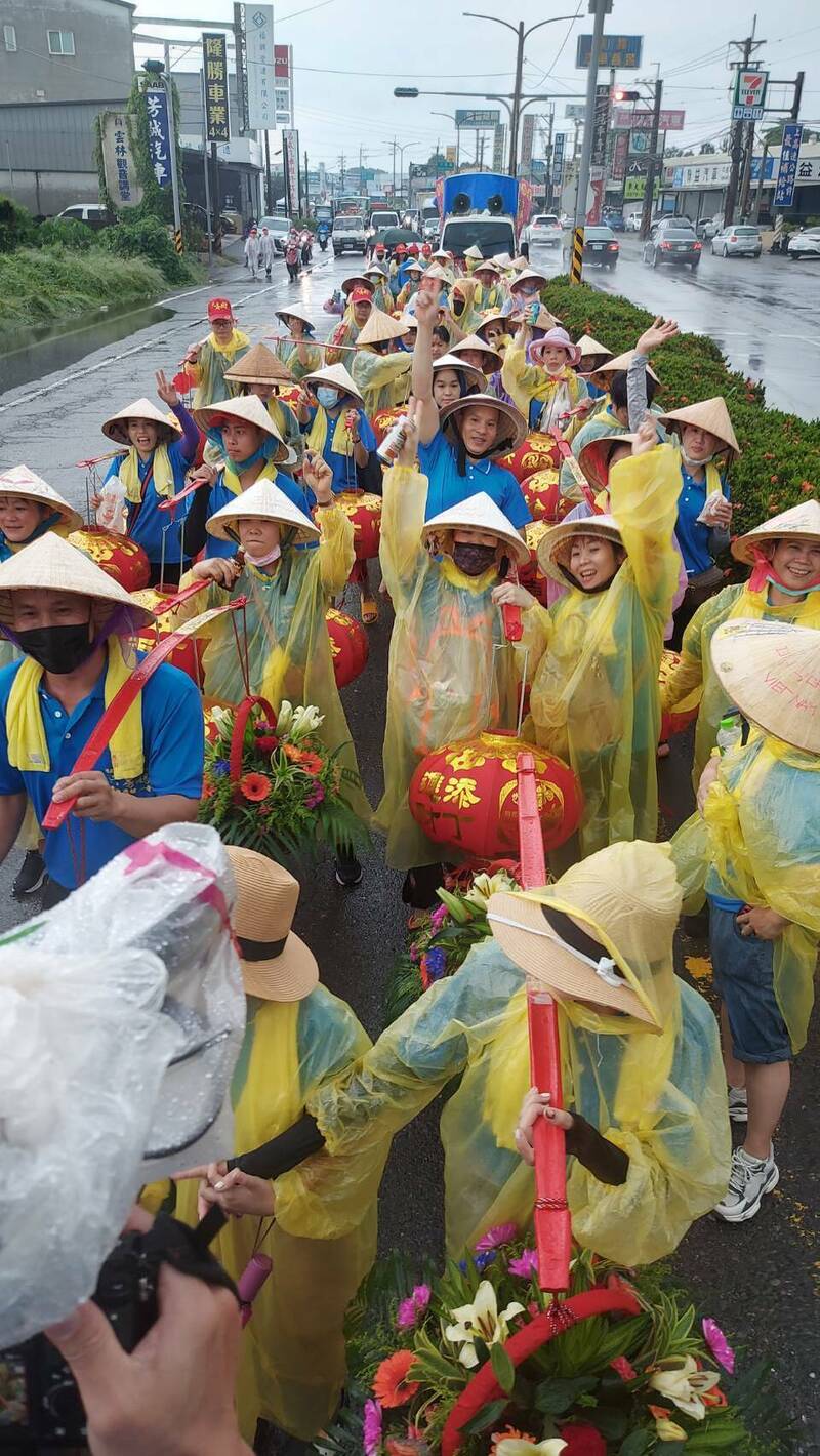 越南新住民、移工今天擔花燈參加六房媽過爐。(圖由阮氏夢琴提供)