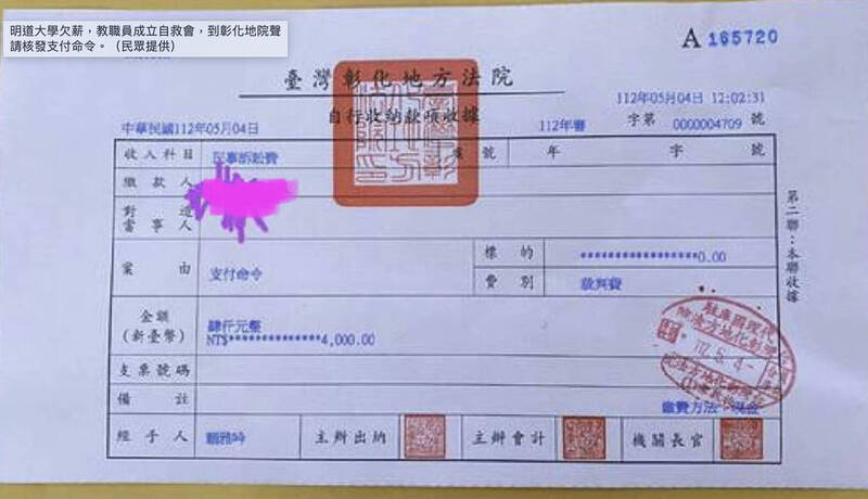明道大學去年11月30日起開始欠薪,後來校方延遲發放去年11、12月及今年1月薪水,至今仍積欠今年2、3、4月等月薪水,教職員生計陷入嚴重困難,包括明道大學聘任編制內專任教師等人組成自救會,向法院請求對債務人核發支付命令。其中有39名教職員率先提出請求,目前已有上百位教職員加入請求行列。