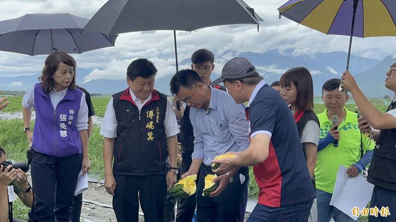 鳳林中心埔西瓜農當場向農委會主委陳吉仲陳情,陳吉仲隨後宣布西瓜啟動天災現金救助程序,且不用回到田間確認是否損失超過二成。(記者花孟璟攝)