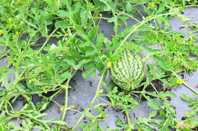 鳳林中心埔二期西瓜種植黃肉西瓜,目前還是中瓜、小瓜尚未成熟,豪雨期間泡水,雖目前外觀似乎完整,但因只要颱風走後放晴隨時會腐爛裂果,無法再繼續長大。(記者花孟璟攝)