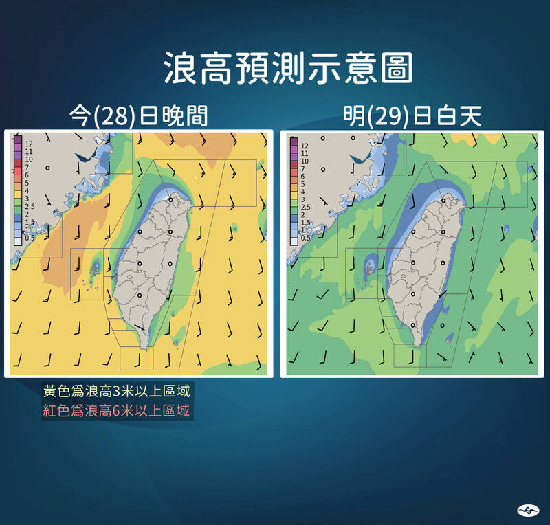 氣象局表示,今天晚上的預報各沿海浪高幾乎仍在3米以上;明天浪高也在2米以上,且有長浪發生機率,民眾前往海邊仍要留意。(氣象局提供)