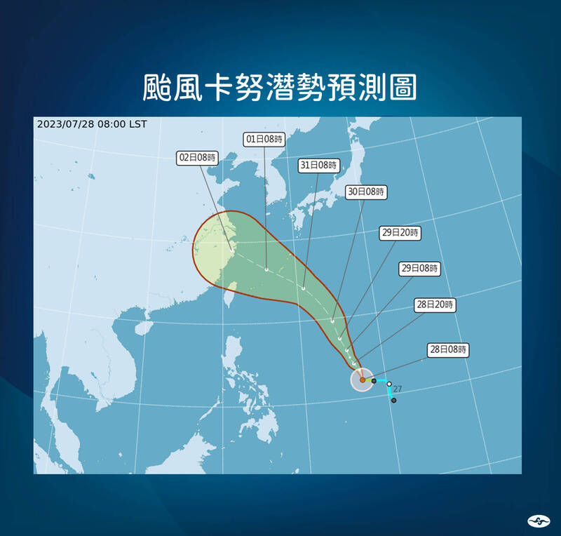 氣象局表示,今日凌晨生成的卡努颱風預計會先朝北北西方向前進,30-31日轉向往西北西方到琉球海面,8月2日接近華中沿海。(氣象局提供)