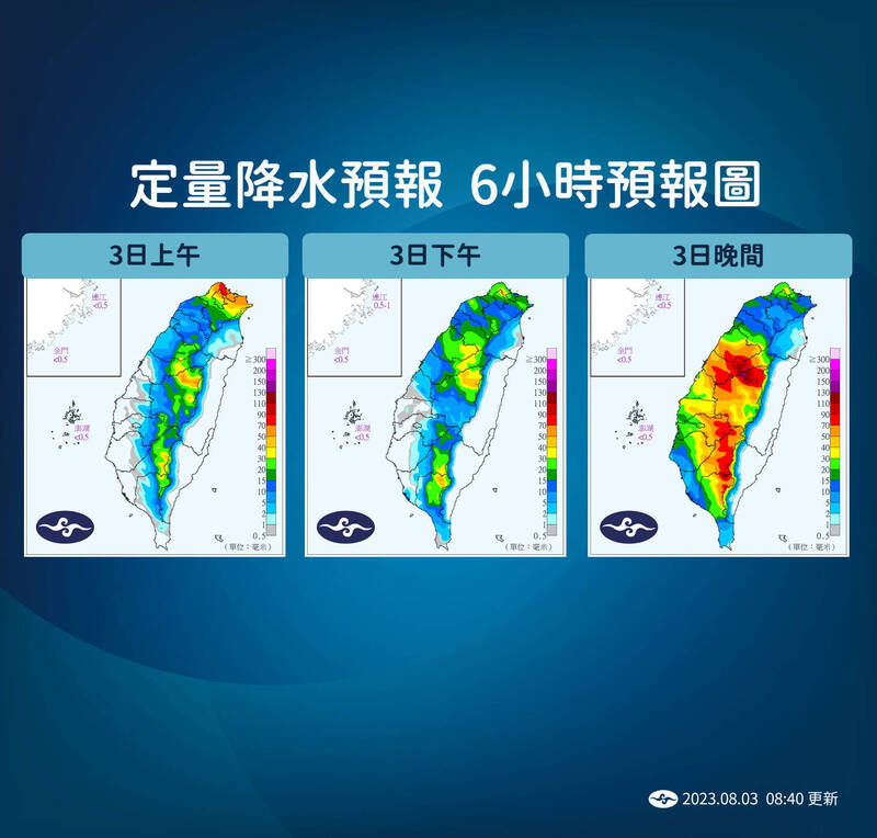 徐仲毅表示,目前在大台北地區降雨是比較廣的,中南部則集中在山區,而接下來北部地區的雨持續,新竹以南上午、下午雨勢雖比較集中在山區,但到了晚上中南部雨勢將明顯增強,超越北部。