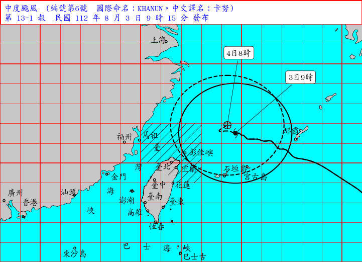 颱風卡努仍在緩緩接近中,預估午後暴風圈觸陸。(圖取自氣象局網站)