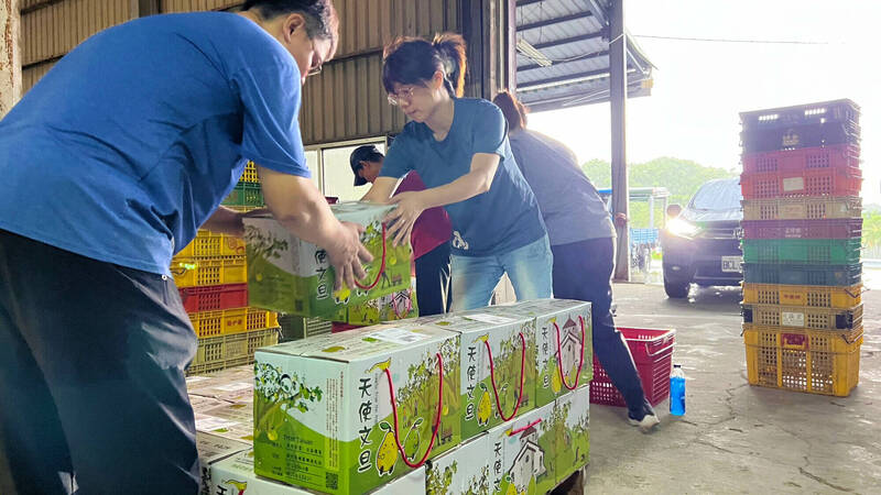 志工張念慈(右)、劉彥麟(左)協助天使文旦出貨。(圖由新竹市天主教仁愛基金會提供)