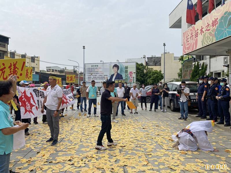 近日工地再度動工,當地居民又質疑廠商未依照契約先興建百姓公祠,今天二度包圍公所,撒冥紙表達不滿,同時出動孝女白琴跪地陳情「鄉長,回來喔」,整整抗議1個多小時,最後鄉長真的被「哭」回來,要求廠商停工,但有個80歲婦人不堪久候昏厥送醫,幸無大礙。