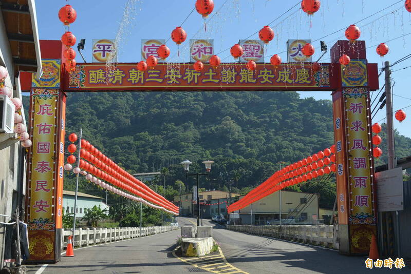 台中太平聖和宮四日開始一連六天舉辦安龍謝土祈安大典,沿路都設置牌樓並掛上紅燈籠。(記者陳建志攝)