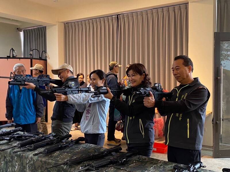 在飛行裝備陳展揭幕活動,興華驛站請到生存遊戲社團設攤,讓民眾體驗定靶射擊和垂降活動,農藝教育中心另設有國軍輕兵器展覽及機槍堡。 (三芝區公所提供)