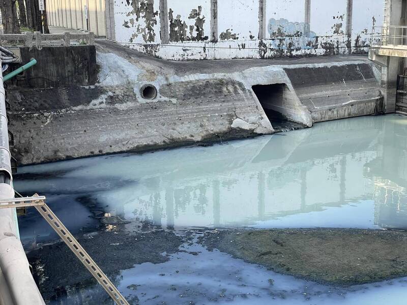 台南市安工3號橋旁,發現呈現大量的乳白色廢水直接往外排。水利局澄清,這些是要進入安平污水處理廠的污水,不會排到運河。(圖由讀者提供)
