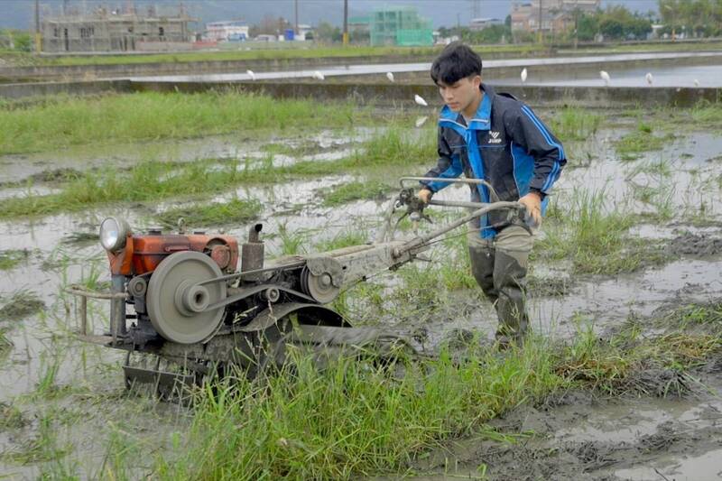 林俊名成立農耕隊,薪聘年輕隊員(見圖,陳寬祐)種稻。(書食糧號提供)