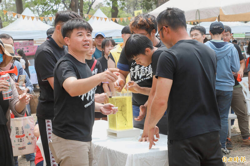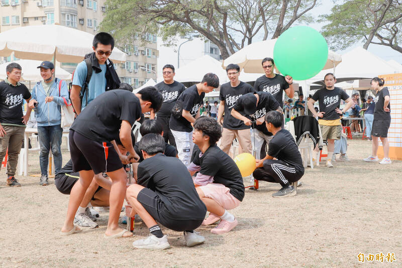 青年組隊挑戰暢飲樂等關卡,希望贏得獎金。(記者王善嬿攝)