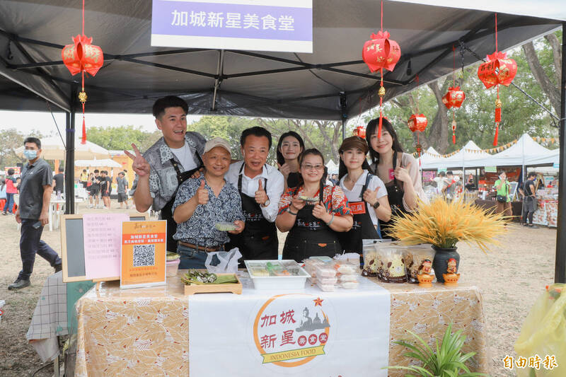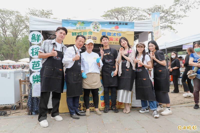 嘉義縣長翁章梁(左二)與藝人阿布等人逛市集,為創意攤商宣傳。(記者王善嬿攝)