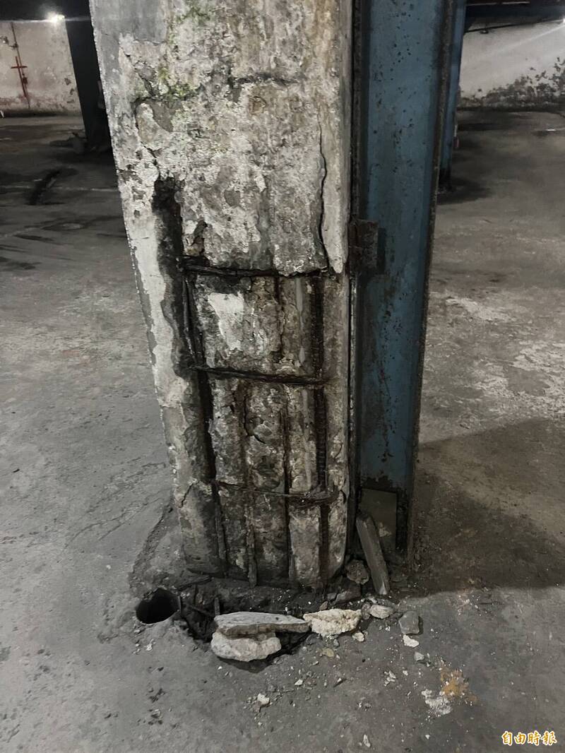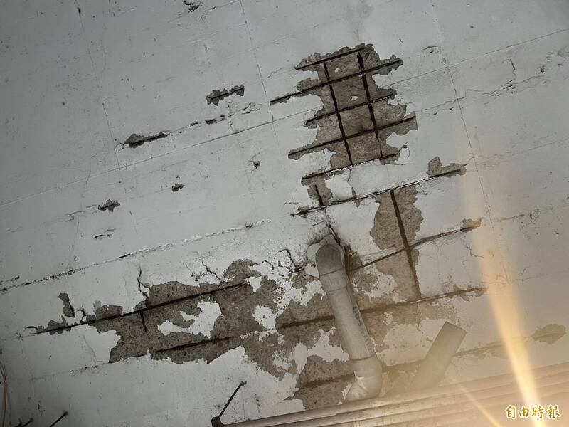 聯宏社區地下室天花板和梁柱鋼筋外露,亟待改善。(記者盧賢秀攝)