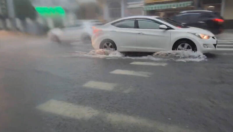 根據交通部中央氣象署觀測資料,今天下午2點到3點,永康區累積雨量達到55亳米,中山北路北側一度積水約25公分,車輛在水中行駛,激起陣陣水花,也有車主擔心造成車輛故障。不過雨勢趨緩後,雨水也逐漸消退。