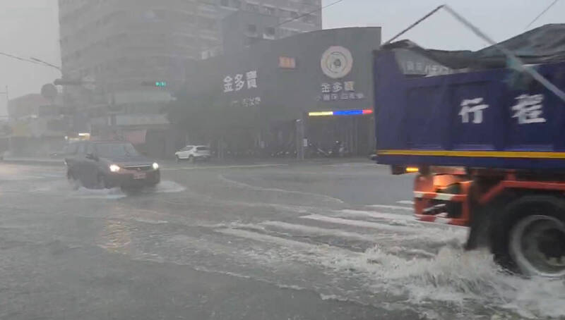 台南永康中山北路北側因驟降大雨,路面一度變水道。(魏萬順提供)