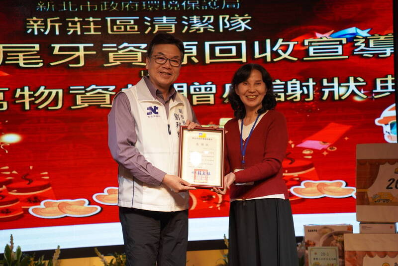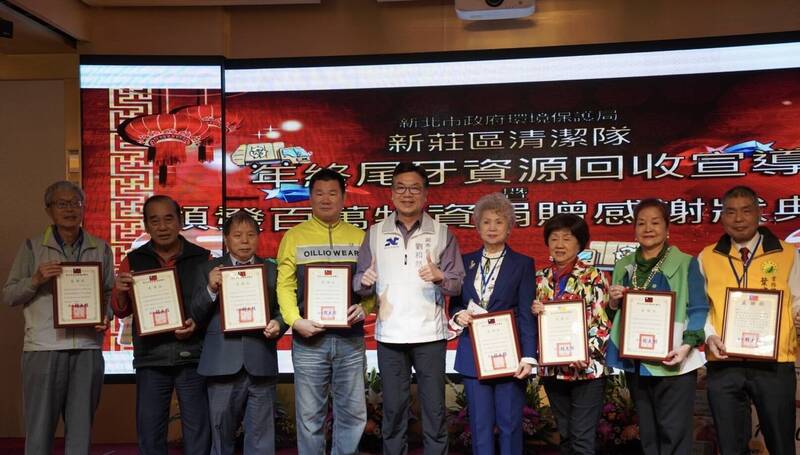 新莊地藏庵、新莊慈祐宮、新莊武聖廟、新莊後港昭德宮、新莊擎天府、新莊保元宮、中華賀聖宮、新莊慈刑府、員全公司、宇村實業、來晟企業、皇記生物科技、天宇旅行社、永通國際物流、永悅建設、頭前里環保志工代表人等16個企業團體捐贈新莊區清潔隊價值逾100萬元物資,獲得表揚。