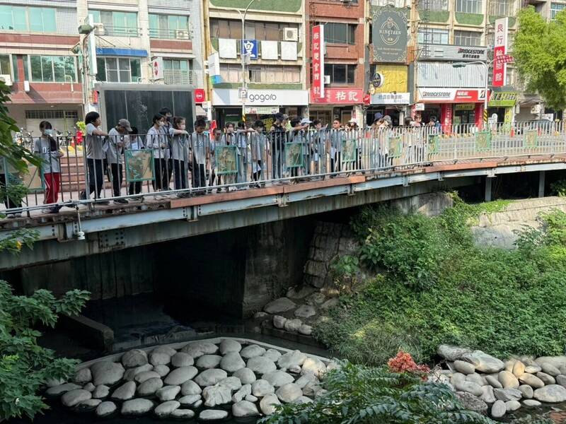 台南東區大同國小學生在竹溪沿岸進行生態觀察。(大同國小提供)
