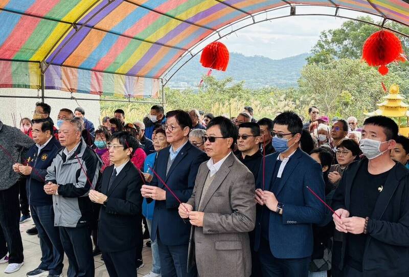 竹科管理局於9日舉辦「竹科銅鑼科學園區福德祠」開光安座典禮,局長陳宗權(右5)、前局長王永壯(右3)、金兆鎔科技公司董事長陳春翰(右4)及地方人士、廠商等共同持香祝禱園區土地公神靈聯合降臨坐鎮,庇佑地方。 (竹科管理局提供)