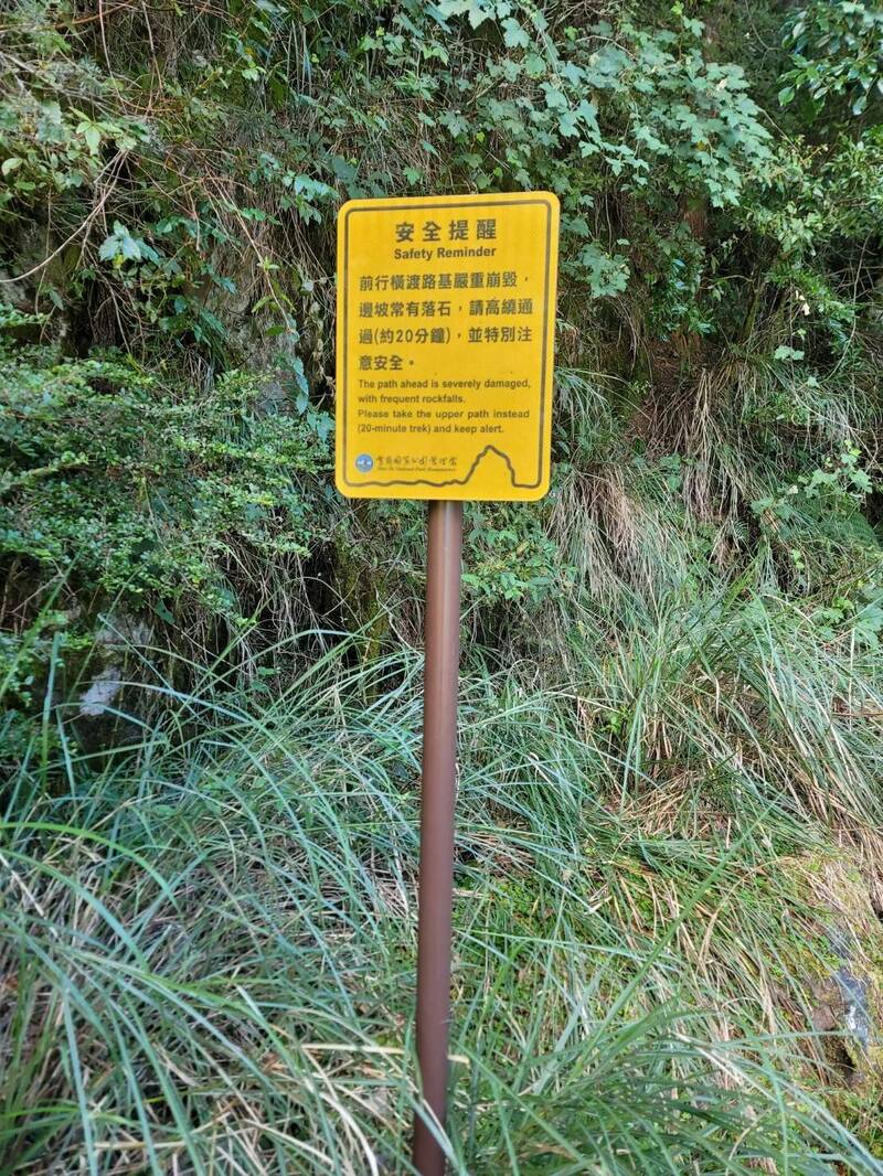 雪管處臉書粉專PO文表示,230林道9K崩壁處,雪管處已架設安全提醒事項並建議高繞的指示牌面,高繞路段也有架設輔助繩索可以使用;或許,採用腰繞崩壁方式可以省去半小時的時間,但,也有可能失去後半輩子的時間,「請大家多走半小時的高繞路,各位也能多走半輩子的登山路」。