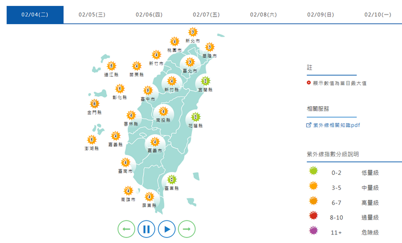 紫外線指數部分,週二宜蘭縣、花蓮縣、台東縣為「低量級」,其餘縣市皆為「中量級」。