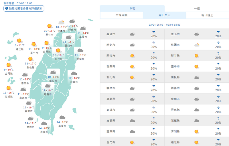 中央氣象署預報,週二強烈大陸冷氣團影響,各地天氣寒冷;北台灣及金門低溫9至11度,其他地區及澎湖低溫10至14度,其中中部以北、宜蘭、花蓮及金門有局部10度以下低溫的機率,馬祖整天氣溫6至11度,白天北部、宜蘭、花蓮及金門、澎湖高溫14至16度,中南部及台東高溫約17至20度。