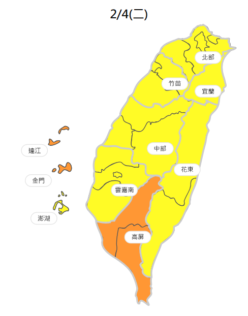 空氣品質方面,週二強烈大陸冷氣團影響,環境風場為東北風,可能挾帶微量境外污染物影響台灣及離島,影響程度視降雨情況及上游污染物累積而有所變化,中南部地區位於下風處,污染物易累積;彰化至雲嘉南沿海地區因風速較強,易引發地表揚塵現象影響空氣品質及能見度。北部、竹苗、中部、雲嘉南、宜蘭、花東空品區及澎湖為「普通」等級;高屏空品區及馬祖、金門為「橘色提醒」等級。