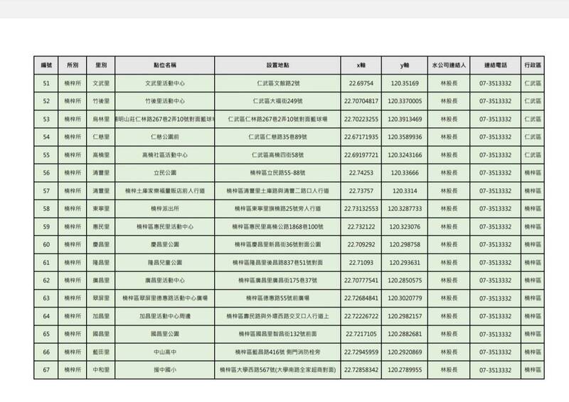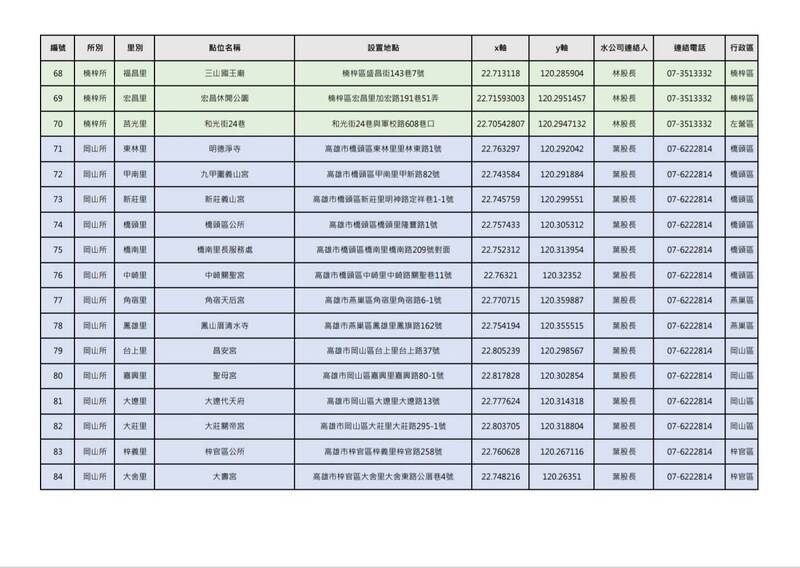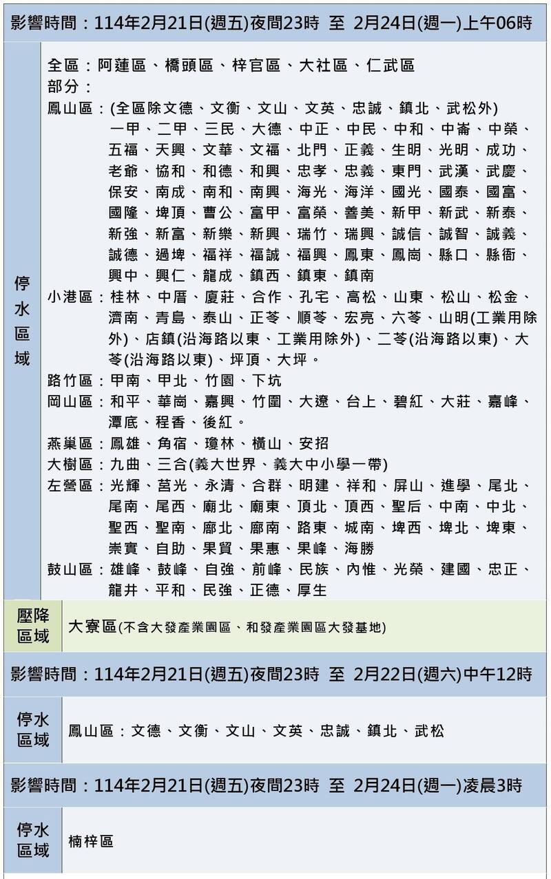 水公司表示,除楠梓全區從21日夜間23時至24日凌晨3時停水52小時外,阿蓮、橋頭、梓官、大社、仁武5區全區從21日夜間23時至24日上午6時停水55小時。